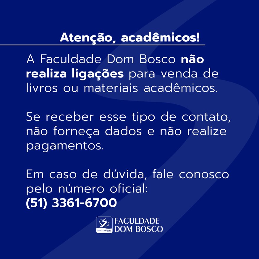 A Faculdade Dom Bosco informa, com urgência, que não realiza ligações telefônicas para oferta ou venda de materiais acadêmicos, como livros ou qualquer outro produto.