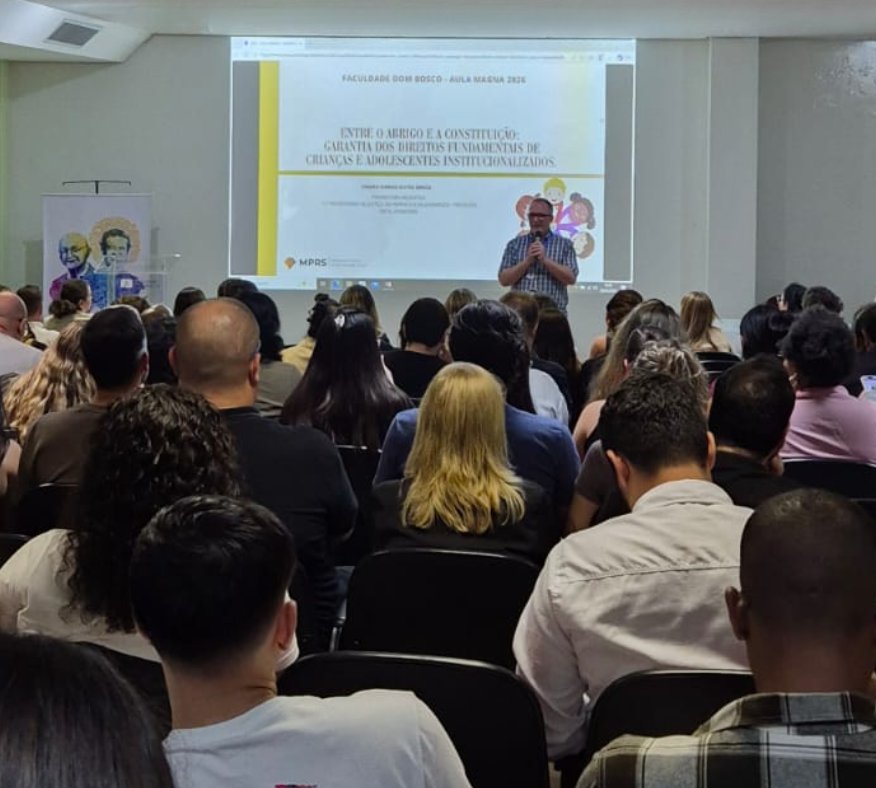 No dia 25 de março, a Faculdade Dom Bosco de Porto Alegre realizou sua tradicional Aula Magna, evento que ocorre anualmente para marcar o início das atividades acadêmicas do semestre. Este ano, o Auditório Padre Marcos Sandrini recebeu docentes e discentes para discutir um tema de grande relevância social: a garantia de direitos fundamentais de crianças e adolescentes institucionalizados.